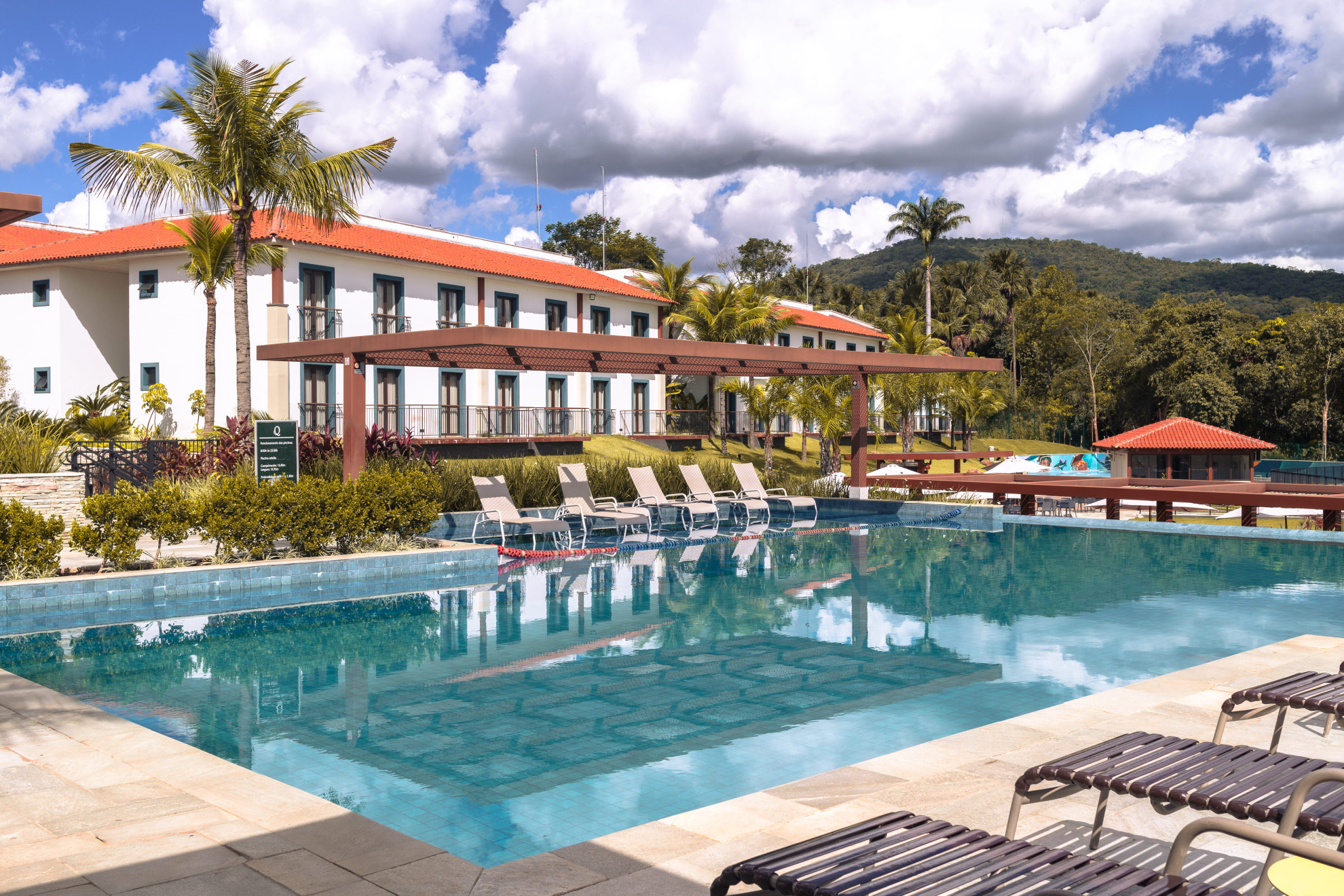 Resort urbano localizado no Centro Histórico da cidade! Você pode passear a pé pelas ruas apreciando o casario do século XVIII, com inúmeros atrativos gastronômicos e lojinhas. O Resort possui estrutura conectada de forma harmoniosa com a natureza, capaz de proporcionar memórias afetivas de bem estar. São mais de 37.000 m2 de área verde e de preservação com rica fauna e flora. A trilha na mata é imperdível! As acomodações são modernas e dispõem de apartamentos de um quarto (39 m2) e dois quartos (59 m2 com dois banheiros), ambos possuem copinha de apoio integrada com sala, frigobar, duas TVs de tela plana e rico enxoval. O parque aquático do Resort é o maior da região. São 3 piscinas adulto com borda infinita, sendo uma delas a maior borda infinita em piscina do Centro Oeste e outra de hidromassagem. Além de piscina infantil, brinquedoteca, monitoras de recreação, sala de massagem, academia, sala de jogos, bar da piscina, restaurantes internos. Aliado a tudo isso um serviço de qualidade está a disposição do hóspede com colaboradores preparados para atender as suas necessidades. Sem contar a vista deslumbrante do pôr do sol, seja nas piscinas ou nas adjacências do Resort!
